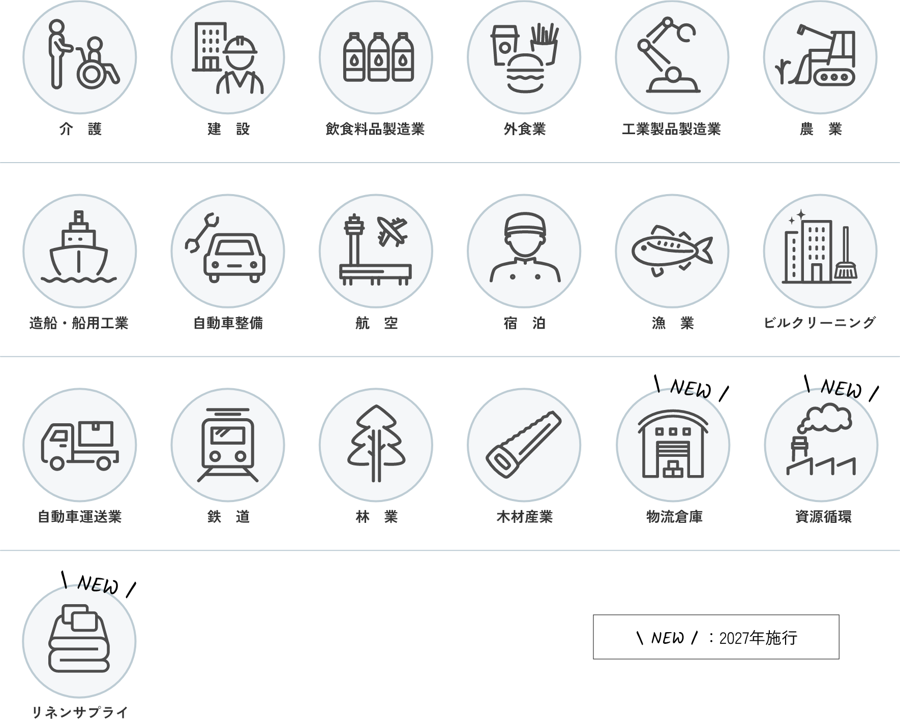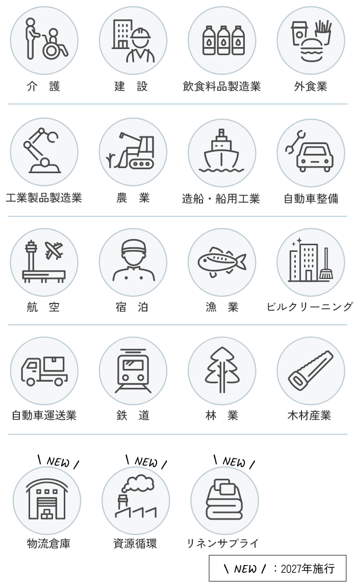 分野ごとに、できる仕事の範囲や必要な技能・日本語力、試験の有無、受け入れ企業の条件などが定められています。企業はその要件に沿って、採用と受け入れを進めます。